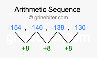 So, what type of sequence is -154, -146, -138, -130? The sequence -154, -146, -138, -130 has a common difference of +8 between each term. We call this kind of sequence an arithmetic sequence. Below is an image illustrating the correlation between the arithmetic sequence -154, -146, -138, -130 and its common difference of +8.