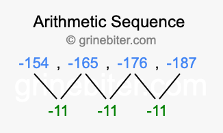 So, what type of sequence is -154, -165, -176, -187? The sequence -154, -165, -176, -187 has a common difference of -11 between each term. We call this kind of sequence an arithmetic sequence. Below is an image illustrating the correlation between the arithmetic sequence -154, -165, -176, -187 and its common difference of -11.