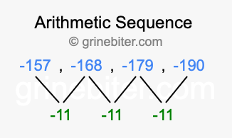 So, what type of sequence is -157, -168, -179, -190? The sequence -157, -168, -179, -190 has a common difference of -11 between each term. We call this kind of sequence an arithmetic sequence. Below is an image illustrating the correlation between the arithmetic sequence -157, -168, -179, -190 and its common difference of -11.