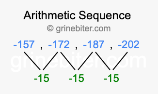 So, what type of sequence is -157, -172, -187, -202? The sequence -157, -172, -187, -202 has a common difference of -15 between each term. We call this kind of sequence an arithmetic sequence. Below is an image illustrating the correlation between the arithmetic sequence -157, -172, -187, -202 and its common difference of -15.