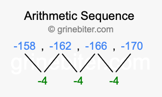 So, what type of sequence is -158, -162, -166, -170? The sequence -158, -162, -166, -170 has a common difference of -4 between each term. We call this kind of sequence an arithmetic sequence. Below is an image illustrating the correlation between the arithmetic sequence -158, -162, -166, -170 and its common difference of -4.