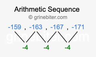 So, what type of sequence is -159, -163, -167, -171? The sequence -159, -163, -167, -171 has a common difference of -4 between each term. We call this kind of sequence an arithmetic sequence. Below is an image illustrating the correlation between the arithmetic sequence -159, -163, -167, -171 and its common difference of -4.
