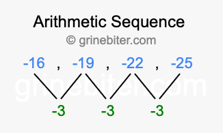 So, what type of sequence is -16, -19, -22, -25? The sequence -16, -19, -22, -25 has a common difference of -3 between each term. We call this kind of sequence an arithmetic sequence. Below is an image illustrating the correlation between the arithmetic sequence -16, -19, -22, -25 and its common difference of -3.