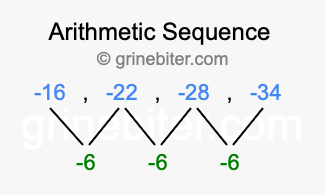 So, what type of sequence is -16, -22, -28, -34? The sequence -16, -22, -28, -34 has a common difference of -6 between each term. We call this kind of sequence an arithmetic sequence. Below is an image illustrating the correlation between the arithmetic sequence -16, -22, -28, -34 and its common difference of -6.