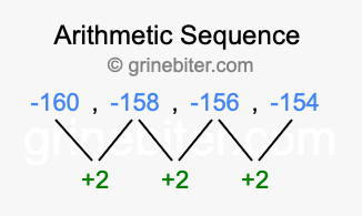 So, what type of sequence is -160, -158, -156, -154? The sequence -160, -158, -156, -154 has a common difference of +2 between each term. We call this kind of sequence an arithmetic sequence. Below is an image illustrating the correlation between the arithmetic sequence -160, -158, -156, -154 and its common difference of +2.