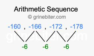 So, what type of sequence is -160, -166, -172, -178? The sequence -160, -166, -172, -178 has a common difference of -6 between each term. We call this kind of sequence an arithmetic sequence. Below is an image illustrating the correlation between the arithmetic sequence -160, -166, -172, -178 and its common difference of -6.