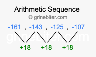 So, what type of sequence is -161, -143, -125, -107? The sequence -161, -143, -125, -107 has a common difference of +18 between each term. We call this kind of sequence an arithmetic sequence. Below is an image illustrating the correlation between the arithmetic sequence -161, -143, -125, -107 and its common difference of +18.
