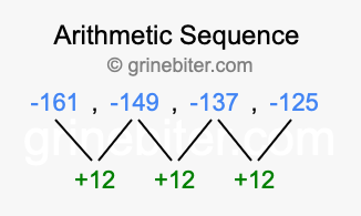 So, what type of sequence is -161, -149, -137, -125? The sequence -161, -149, -137, -125 has a common difference of +12 between each term. We call this kind of sequence an arithmetic sequence. Below is an image illustrating the correlation between the arithmetic sequence -161, -149, -137, -125 and its common difference of +12.