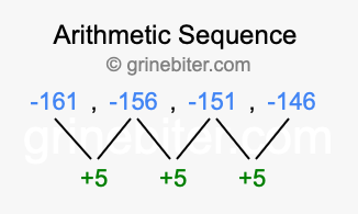 So, what type of sequence is -161, -156, -151, -146? The sequence -161, -156, -151, -146 has a common difference of +5 between each term. We call this kind of sequence an arithmetic sequence. Below is an image illustrating the correlation between the arithmetic sequence -161, -156, -151, -146 and its common difference of +5.