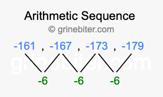 So, what type of sequence is -161, -167, -173, -179? The sequence -161, -167, -173, -179 has a common difference of -6 between each term. We call this kind of sequence an arithmetic sequence. Below is an image illustrating the correlation between the arithmetic sequence -161, -167, -173, -179 and its common difference of -6.