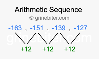 So, what type of sequence is -163, -151, -139, -127? The sequence -163, -151, -139, -127 has a common difference of +12 between each term. We call this kind of sequence an arithmetic sequence. Below is an image illustrating the correlation between the arithmetic sequence -163, -151, -139, -127 and its common difference of +12.