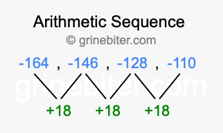 So, what type of sequence is -164, -146, -128, -110? The sequence -164, -146, -128, -110 has a common difference of +18 between each term. We call this kind of sequence an arithmetic sequence. Below is an image illustrating the correlation between the arithmetic sequence -164, -146, -128, -110 and its common difference of +18.