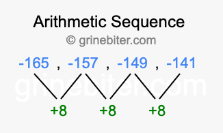 So, what type of sequence is -165, -157, -149, -141? The sequence -165, -157, -149, -141 has a common difference of +8 between each term. We call this kind of sequence an arithmetic sequence. Below is an image illustrating the correlation between the arithmetic sequence -165, -157, -149, -141 and its common difference of +8.
