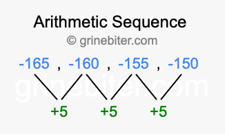 So, what type of sequence is -165, -160, -155, -150? The sequence -165, -160, -155, -150 has a common difference of +5 between each term. We call this kind of sequence an arithmetic sequence. Below is an image illustrating the correlation between the arithmetic sequence -165, -160, -155, -150 and its common difference of +5.