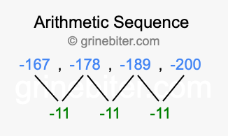 So, what type of sequence is -167, -178, -189, -200? The sequence -167, -178, -189, -200 has a common difference of -11 between each term. We call this kind of sequence an arithmetic sequence. Below is an image illustrating the correlation between the arithmetic sequence -167, -178, -189, -200 and its common difference of -11.