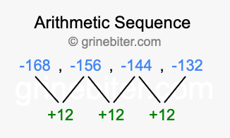 So, what type of sequence is -168, -156, -144, -132? The sequence -168, -156, -144, -132 has a common difference of +12 between each term. We call this kind of sequence an arithmetic sequence. Below is an image illustrating the correlation between the arithmetic sequence -168, -156, -144, -132 and its common difference of +12.
