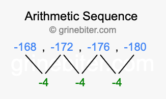 So, what type of sequence is -168, -172, -176, -180? The sequence -168, -172, -176, -180 has a common difference of -4 between each term. We call this kind of sequence an arithmetic sequence. Below is an image illustrating the correlation between the arithmetic sequence -168, -172, -176, -180 and its common difference of -4.