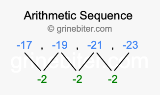 So, what type of sequence is -17, -19, -21, -23? The sequence -17, -19, -21, -23 has a common difference of -2 between each term. We call this kind of sequence an arithmetic sequence. Below is an image illustrating the correlation between the arithmetic sequence -17, -19, -21, -23 and its common difference of -2.