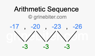 So, what type of sequence is -17, -20, -23, -26? The sequence -17, -20, -23, -26 has a common difference of -3 between each term. We call this kind of sequence an arithmetic sequence. Below is an image illustrating the correlation between the arithmetic sequence -17, -20, -23, -26 and its common difference of -3.
