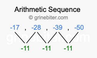 So, what type of sequence is -17, -28, -39, -50? The sequence -17, -28, -39, -50 has a common difference of -11 between each term. We call this kind of sequence an arithmetic sequence. Below is an image illustrating the correlation between the arithmetic sequence -17, -28, -39, -50 and its common difference of -11.