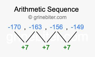 So, what type of sequence is -170, -163, -156, -149? The sequence -170, -163, -156, -149 has a common difference of +7 between each term. We call this kind of sequence an arithmetic sequence. Below is an image illustrating the correlation between the arithmetic sequence -170, -163, -156, -149 and its common difference of +7.