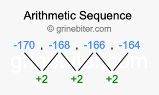 So, what type of sequence is -170, -168, -166, -164? The sequence -170, -168, -166, -164 has a common difference of +2 between each term. We call this kind of sequence an arithmetic sequence. Below is an image illustrating the correlation between the arithmetic sequence -170, -168, -166, -164 and its common difference of +2.