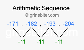 So, what type of sequence is -171, -182, -193, -204? The sequence -171, -182, -193, -204 has a common difference of -11 between each term. We call this kind of sequence an arithmetic sequence. Below is an image illustrating the correlation between the arithmetic sequence -171, -182, -193, -204 and its common difference of -11.