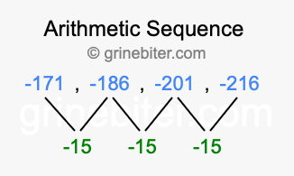 So, what type of sequence is -171, -186, -201, -216? The sequence -171, -186, -201, -216 has a common difference of -15 between each term. We call this kind of sequence an arithmetic sequence. Below is an image illustrating the correlation between the arithmetic sequence -171, -186, -201, -216 and its common difference of -15.
