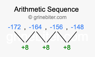 So, what type of sequence is -172, -164, -156, -148? The sequence -172, -164, -156, -148 has a common difference of +8 between each term. We call this kind of sequence an arithmetic sequence. Below is an image illustrating the correlation between the arithmetic sequence -172, -164, -156, -148 and its common difference of +8.