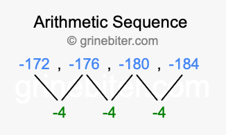 So, what type of sequence is -172, -176, -180, -184? The sequence -172, -176, -180, -184 has a common difference of -4 between each term. We call this kind of sequence an arithmetic sequence. Below is an image illustrating the correlation between the arithmetic sequence -172, -176, -180, -184 and its common difference of -4.
