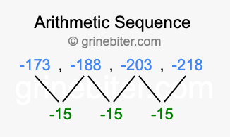 So, what type of sequence is -173, -188, -203, -218? The sequence -173, -188, -203, -218 has a common difference of -15 between each term. We call this kind of sequence an arithmetic sequence. Below is an image illustrating the correlation between the arithmetic sequence -173, -188, -203, -218 and its common difference of -15.