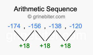 So, what type of sequence is -174, -156, -138, -120? The sequence -174, -156, -138, -120 has a common difference of +18 between each term. We call this kind of sequence an arithmetic sequence. Below is an image illustrating the correlation between the arithmetic sequence -174, -156, -138, -120 and its common difference of +18.