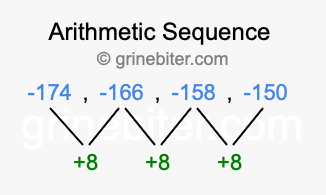 So, what type of sequence is -174, -166, -158, -150? The sequence -174, -166, -158, -150 has a common difference of +8 between each term. We call this kind of sequence an arithmetic sequence. Below is an image illustrating the correlation between the arithmetic sequence -174, -166, -158, -150 and its common difference of +8.