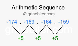 So, what type of sequence is -174, -169, -164, -159? The sequence -174, -169, -164, -159 has a common difference of +5 between each term. We call this kind of sequence an arithmetic sequence. Below is an image illustrating the correlation between the arithmetic sequence -174, -169, -164, -159 and its common difference of +5.