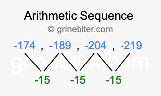 So, what type of sequence is -174, -189, -204, -219? The sequence -174, -189, -204, -219 has a common difference of -15 between each term. We call this kind of sequence an arithmetic sequence. Below is an image illustrating the correlation between the arithmetic sequence -174, -189, -204, -219 and its common difference of -15.