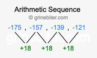 So, what type of sequence is -175, -157, -139, -121? The sequence -175, -157, -139, -121 has a common difference of +18 between each term. We call this kind of sequence an arithmetic sequence. Below is an image illustrating the correlation between the arithmetic sequence -175, -157, -139, -121 and its common difference of +18.