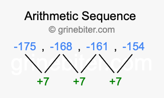So, what type of sequence is -175, -168, -161, -154? The sequence -175, -168, -161, -154 has a common difference of +7 between each term. We call this kind of sequence an arithmetic sequence. Below is an image illustrating the correlation between the arithmetic sequence -175, -168, -161, -154 and its common difference of +7.