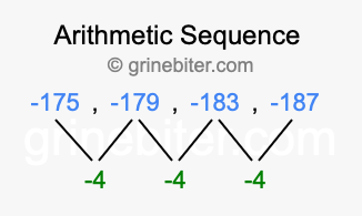 So, what type of sequence is -175, -179, -183, -187? The sequence -175, -179, -183, -187 has a common difference of -4 between each term. We call this kind of sequence an arithmetic sequence. Below is an image illustrating the correlation between the arithmetic sequence -175, -179, -183, -187 and its common difference of -4.
