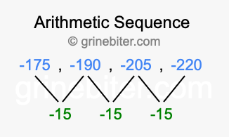 So, what type of sequence is -175, -190, -205, -220? The sequence -175, -190, -205, -220 has a common difference of -15 between each term. We call this kind of sequence an arithmetic sequence. Below is an image illustrating the correlation between the arithmetic sequence -175, -190, -205, -220 and its common difference of -15.