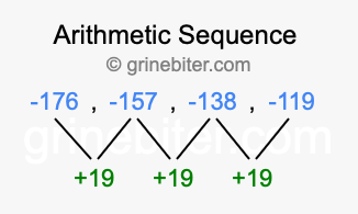 So, what type of sequence is -176, -157, -138, -119? The sequence -176, -157, -138, -119 has a common difference of +19 between each term. We call this kind of sequence an arithmetic sequence. Below is an image illustrating the correlation between the arithmetic sequence -176, -157, -138, -119 and its common difference of +19.