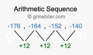So, what type of sequence is -176, -164, -152, -140? The sequence -176, -164, -152, -140 has a common difference of +12 between each term. We call this kind of sequence an arithmetic sequence. Below is an image illustrating the correlation between the arithmetic sequence -176, -164, -152, -140 and its common difference of +12.