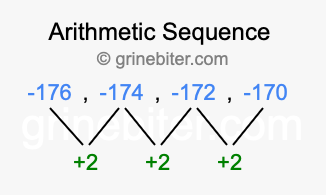 So, what type of sequence is -176, -174, -172, -170? The sequence -176, -174, -172, -170 has a common difference of +2 between each term. We call this kind of sequence an arithmetic sequence. Below is an image illustrating the correlation between the arithmetic sequence -176, -174, -172, -170 and its common difference of +2.