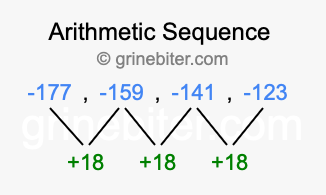 So, what type of sequence is -177, -159, -141, -123? The sequence -177, -159, -141, -123 has a common difference of +18 between each term. We call this kind of sequence an arithmetic sequence. Below is an image illustrating the correlation between the arithmetic sequence -177, -159, -141, -123 and its common difference of +18.