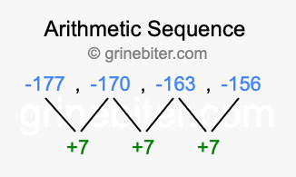 So, what type of sequence is -177, -170, -163, -156? The sequence -177, -170, -163, -156 has a common difference of +7 between each term. We call this kind of sequence an arithmetic sequence. Below is an image illustrating the correlation between the arithmetic sequence -177, -170, -163, -156 and its common difference of +7.