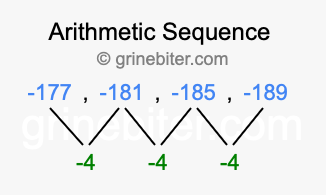 So, what type of sequence is -177, -181, -185, -189? The sequence -177, -181, -185, -189 has a common difference of -4 between each term. We call this kind of sequence an arithmetic sequence. Below is an image illustrating the correlation between the arithmetic sequence -177, -181, -185, -189 and its common difference of -4.
