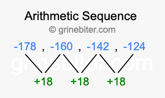So, what type of sequence is -178, -160, -142, -124? The sequence -178, -160, -142, -124 has a common difference of +18 between each term. We call this kind of sequence an arithmetic sequence. Below is an image illustrating the correlation between the arithmetic sequence -178, -160, -142, -124 and its common difference of +18.