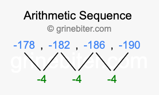 So, what type of sequence is -178, -182, -186, -190? The sequence -178, -182, -186, -190 has a common difference of -4 between each term. We call this kind of sequence an arithmetic sequence. Below is an image illustrating the correlation between the arithmetic sequence -178, -182, -186, -190 and its common difference of -4.