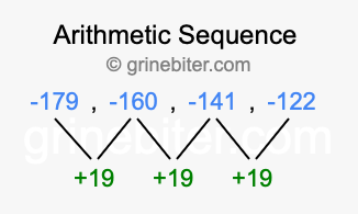 So, what type of sequence is -179, -160, -141, -122? The sequence -179, -160, -141, -122 has a common difference of +19 between each term. We call this kind of sequence an arithmetic sequence. Below is an image illustrating the correlation between the arithmetic sequence -179, -160, -141, -122 and its common difference of +19.