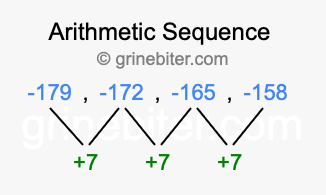 So, what type of sequence is -179, -172, -165, -158? The sequence -179, -172, -165, -158 has a common difference of +7 between each term. We call this kind of sequence an arithmetic sequence. Below is an image illustrating the correlation between the arithmetic sequence -179, -172, -165, -158 and its common difference of +7.