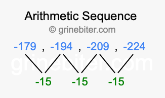 So, what type of sequence is -179, -194, -209, -224? The sequence -179, -194, -209, -224 has a common difference of -15 between each term. We call this kind of sequence an arithmetic sequence. Below is an image illustrating the correlation between the arithmetic sequence -179, -194, -209, -224 and its common difference of -15.